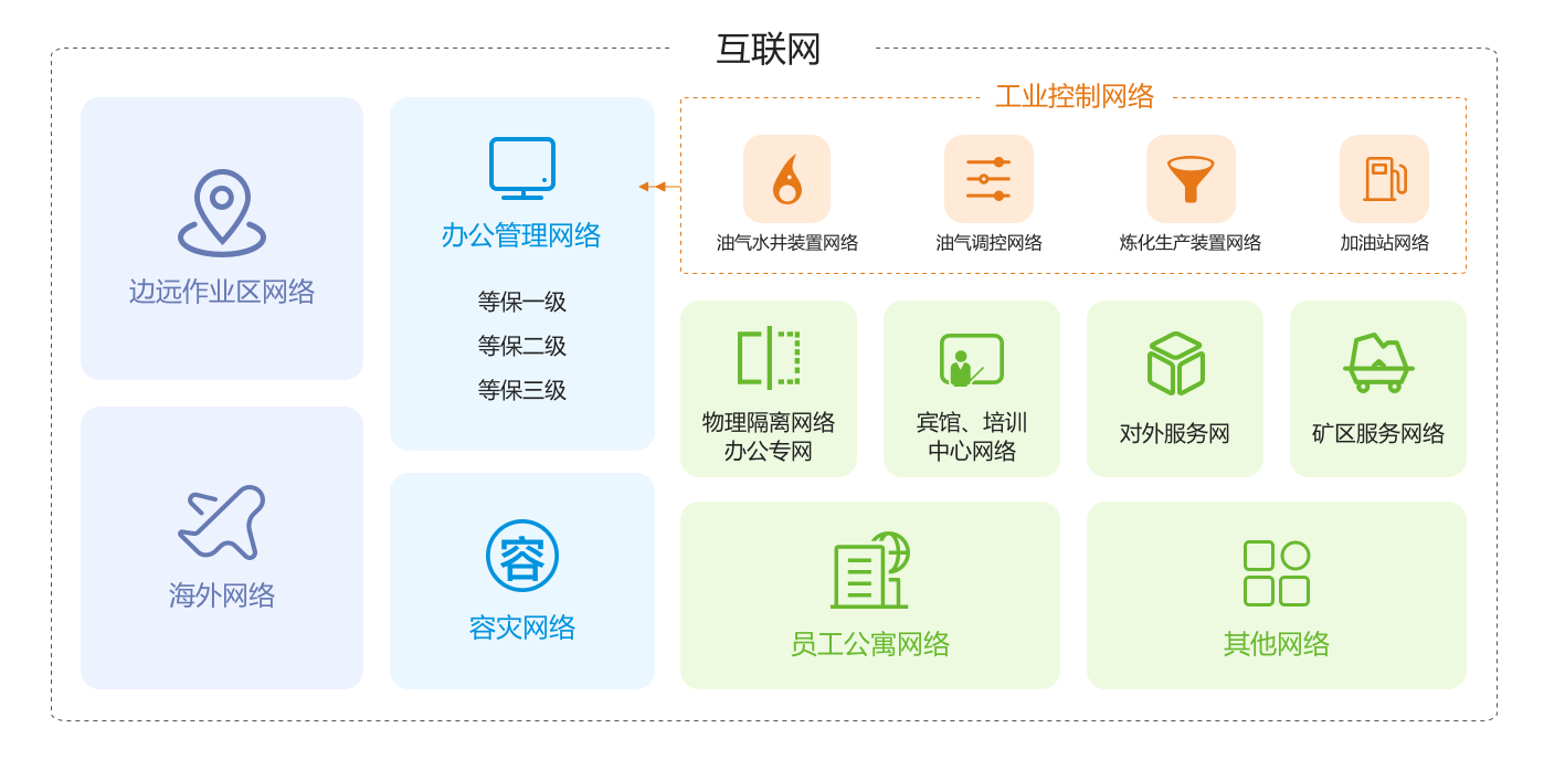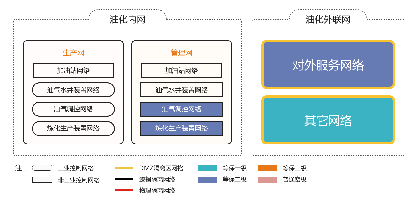 ÓÍ»¯ÄÚÍø°üÀ¨ÖÎÀíÍøºÍÉú²úÍø¡£ÖÎÀíÍøÓɰ칫ÖÎÀíÍøÂç¡¢ÍâÑóÍøÂç¡¢±ßÔ¶×÷ÒµÇøÍøÂç¡¢¿óÇø·þÎñÍøÂç×é³É¡£Éú²úÍøÓɼÓÓÍÕ¾ÍøÂç¡¢ÓÍÆøË®¾®×°ÖÃÍøÂç¡¢ÓÍÆøµ÷¿ØÍøÂç¡¢Á¶»¯Éú²ú×°ÖÃÍøÂç×é³É¡£