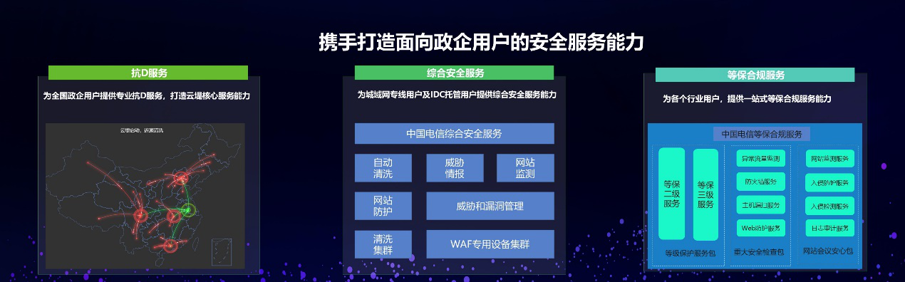 双方团结各自领域优势,携手打造面向政企用户的清静服务能力,划分在抗D服务、综合清静服务和等保合规服务开展相助,为客户提供异常流量洗濯、网络清静威胁预警、Web监测与防护和等保合规等一系列专享的清静服务。