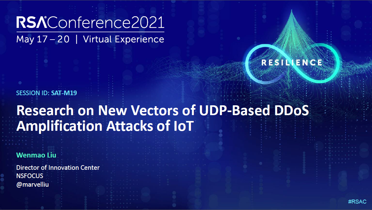 RSA×÷ΪȫÇò¹æÄ£×î´óµÄÍøÂçÇå¾²ÐÐÒµ¾Û»á£¬Æù½ñÒѾÙÐÐ30½ì£¬Ò»Ö±×ÅÑÛÓÚÍÆ¶¯È«ÇòÍøÂçÇå¾²½çµÄ¹²Ïí¡¢Á¢ÒìÓëǰ½ø¡£2021ÄêRSA´ó»á£¬AG¹«Ë¾¿Æ¼¼ÍÑÓ±¶ø³ö£¬ÔÚÎïÁªÍøÇå¾²ÂÛ̳½ÒÏþÌâΪ¡¶ÎïÁªÍøÖлùÓÚUDPµÄDDoSÐÂÐÍ·´Éä¹¥»÷Ñо¿¡·£¨Research on New Vectors of UDP-Based DDoS Amplification Attacks of IoT£¬[SAT-M19]£©µÄÖ÷ÌâÑݽ²£¬ÕâÊÇÖйúÇå¾²³§ÉÌÊ״εÇÉÏRSAC´ó»áµÄÖ÷ÌâÑݽ²Îę̀¡£AG¹«Ë¾¿Æ¼¼Á¢ÒìÖÐÐÄ×ܼàÁõÎÄí®²©Ê¿´ú±íAG¹«Ë¾¿Æ¼¼µÄÎïÁªÍøÇå¾²Ñо¿ÍŶӾÙÐÐÁËÖ÷ÌâÑݽ²¡£