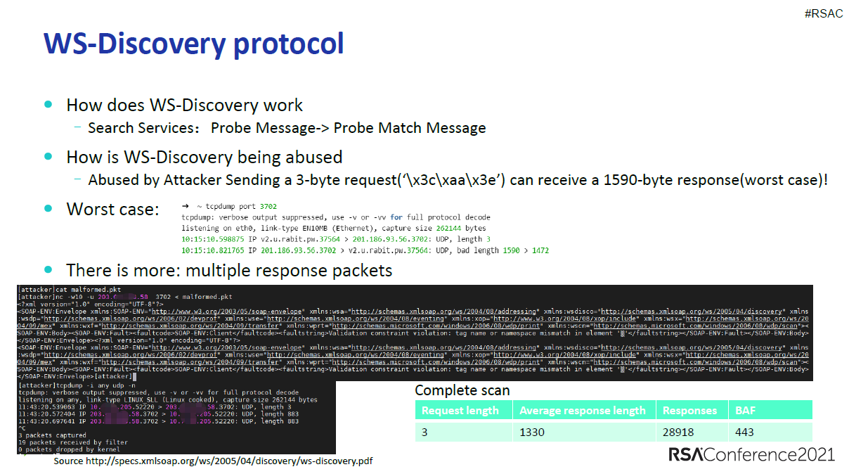 WS-DiscoveryÊÇ»ùÓÚUDPµÄ¡¢ÓÃÓÚWeb·þÎñ·¢Ã÷µÄµ¥²¥ÐÒé¡£ÆäÊÂÇéÔÀíÊǿͻ§¶Ë·¢ËÍUDP̽²âÐÂÎÅËÑË÷·þÎñ£¬È»ºóÆÚ´ýÓ¦´ð¡£¸ÃÐÒéÏêϸ±»ÀÄÓõÄÇéÐÎÊÇ£º¹¥»÷Õß·¢ËÍÒ»¸ö3×Ö½ÚµÄÇëÇó£º3c¡¢aa¡¢3e£¬²¢Ð¯´øÒ»¸öÓÕÆµÄÔ´µØµã£¬·þÎñ»á»Ø¸´Ò»¸ö1590×Ö½ÚµÄÏìÓ¦¡£