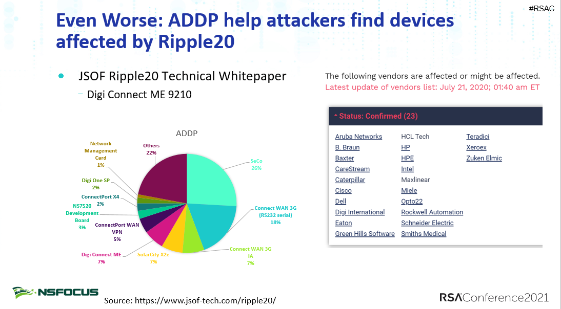 ÊÂʵÉÏ£¬ADDP±»Ðí´ó¶¼ÂëÍøÂç×°±¸Ê¹Ó㬴ó×ÚÕâЩװ±¸¿ÉÄܱ£´æRipple20Îó²î¡£Òò¶ø£¬¹¥»÷Õß¿ÉÒÔͨ¹ý·¢Ã÷̻¶µÄADDP·þÎñ£¬ÔÙÑéÖ¤Ripple20Îó²î£¬Ôò¿ÉÒÔÌᳫһЩ¹¥»÷¡£